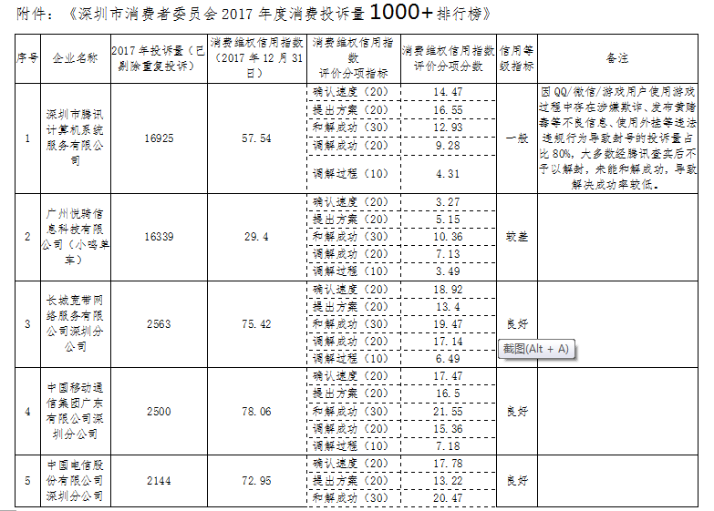 附件:《深圳市消費(fèi)者委員會(huì)2017年度消費(fèi)投訴量1000+排行榜》