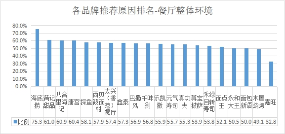 餐廳整體環(huán)境推薦率排名:排名前三的是海底撈、滿(mǎn)記甜品、八合里海記;