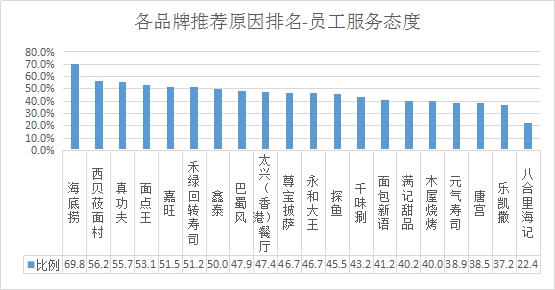 員工服務(wù)態(tài)度推薦率排名:排名前三的是海底撈、西貝莜面村、真功夫;