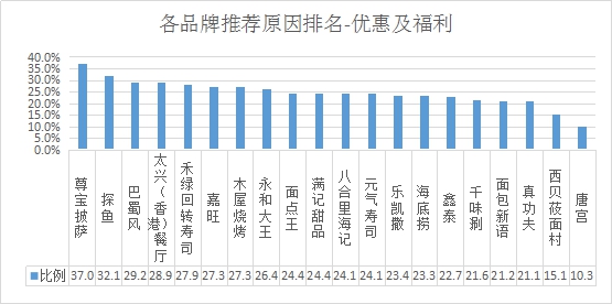 排名第一的是尊寶披薩,優(yōu)惠及福利推薦率為37.0%;其次是探魚(yú),推薦率為32.1%;第三名是巴蜀風(fēng),推薦率為29.2%。