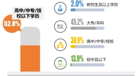 本次調(diào)研中,連鎖餐飲消費(fèi)者中,23歲-30歲是主要消費(fèi)者,占比36.1%,30歲以下的消費(fèi)者占比為65.7%。52.8%的受訪(fǎng)者學(xué)歷為高中/中專(zhuān)/技校及以下 。