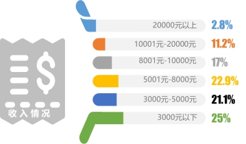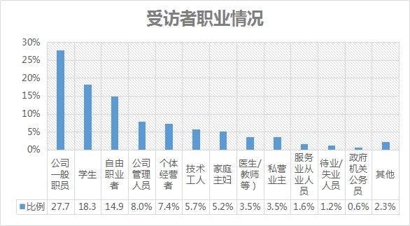 本次調(diào)研中,公司一般職員的比例最高,為27.7%,其次是學(xué)生,占比為18.3%。53.9%的受訪(fǎng)者其個(gè)人月收入超過(guò)5000元。