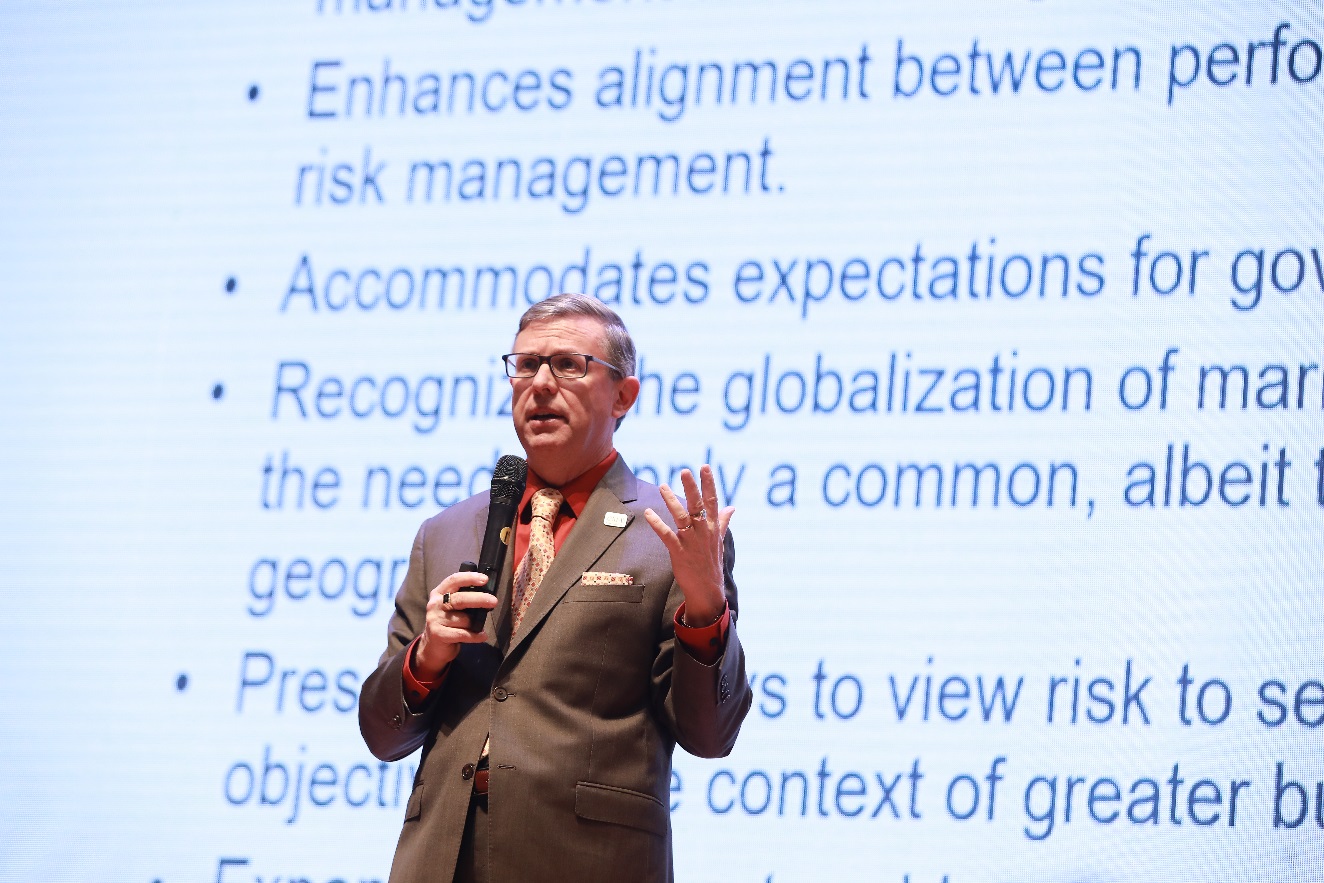 IMA總裁兼首席執(zhí)行官 Jeffrey Thomson以“企業(yè)風(fēng)險管理——風(fēng)險與戰(zhàn)略和績效協(xié)調(diào)一致”為主題,圍繞美國反虛假財(cái)務(wù)報(bào)告委員會下屬的發(fā)起人委員會C OSO的企業(yè)風(fēng)險管理最新框架,與現(xiàn)場嘉賓分享了企業(yè)風(fēng)險管理所需要注意的問題。Thomson表示,風(fēng)險管理并非單一孤立,而應(yīng)當(dāng)貫穿于戰(zhàn)略制定、績效考核、內(nèi)部控制等企業(yè)管理的方方面面。他強(qiáng)調(diào),風(fēng)險管理并非是“杜絕”風(fēng)險,而更重要的是確定風(fēng)險偏好,管控風(fēng)險的同時分析發(fā)現(xiàn)企業(yè)發(fā)展的機(jī)遇。
