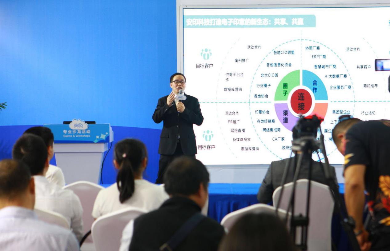 隨后,安印科技營銷副總劉昕發(fā)表了演講,他給大家分享了安印對電子簽章技術(shù)應(yīng)用前景的思考和探索,并對安印電子印章生態(tài)圈進行全方位的解讀。劉總表示,對于企業(yè)來說進入數(shù)字時代的深遠影響與沖擊,絕不僅僅是技術(shù)上的創(chuàng)新與突破,更將是一次理念認識的徹底洗禮。通過由傳統(tǒng)蓋章模式向互聯(lián)網(wǎng)簽章模式的轉(zhuǎn)變,安印電子印章生態(tài)圈能有效地助力企業(yè)運營的提質(zhì)、增效、降本,不斷迸發(fā)出改變與前進的力量。