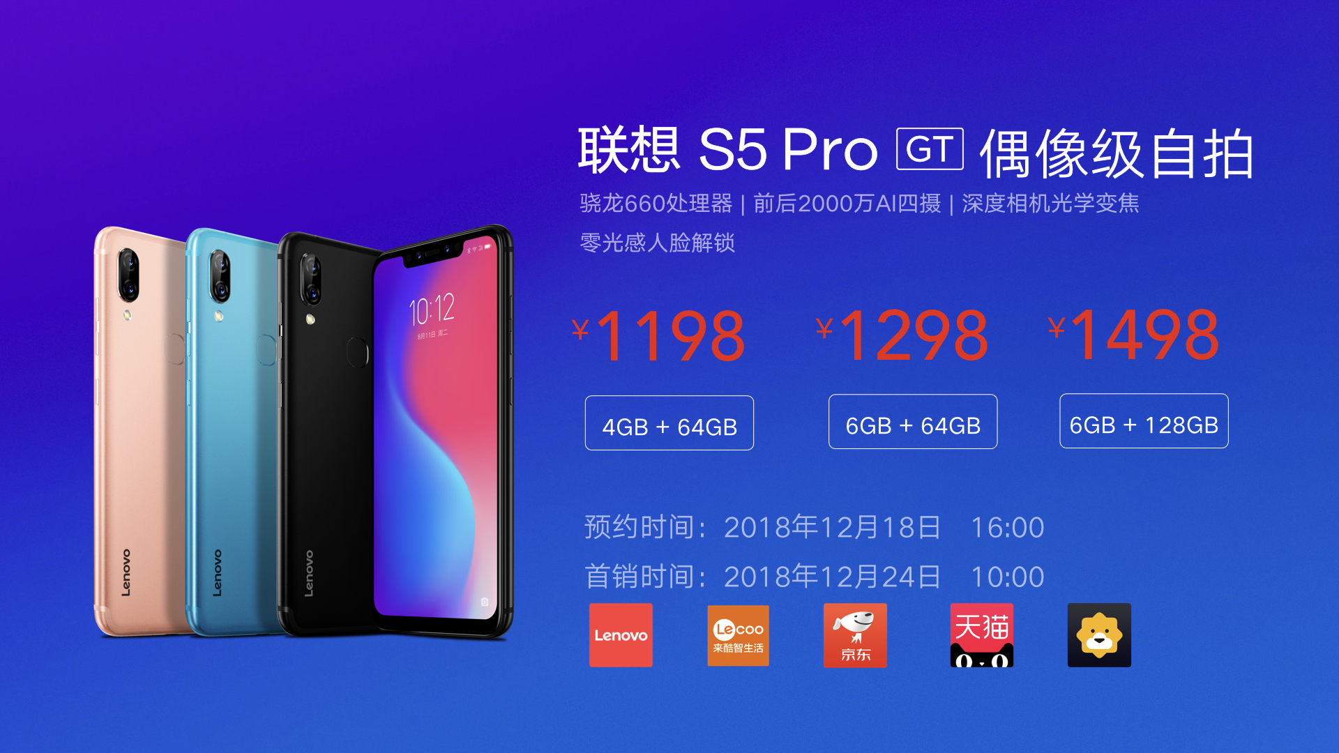 聯(lián)想S5 Pro升級(jí)版,配置升級(jí),美麗升級(jí),售價(jià)4 G+64G為1198元,6 G+64G為1298元,6 G+128G為1498元。12月18日在全平臺(tái)開啟預(yù)約,12月24日開啟首銷。