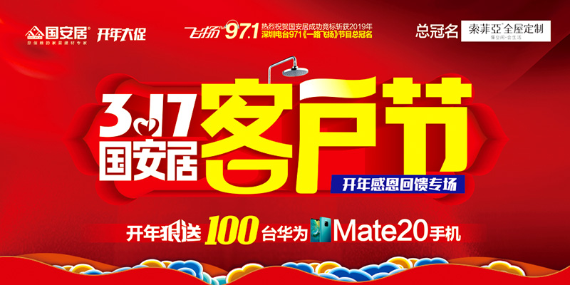 國(guó)安居一直心懷感恩,感謝十多年來累計(jì)30萬老客戶的信賴與支持,此次活動(dòng)不僅是為了品牌優(yōu)惠,更多的是給老客戶送去關(guān)懷和福利。國(guó)安居特聯(lián)合深圳電臺(tái)971王牌節(jié)目一路飛揚(yáng)鼎力巨獻(xiàn),聯(lián)手旗下百位工廠總裁打造開年大促,推出多重優(yōu)惠:1、開年狠送100臺(tái)華為mate20手機(jī);2、聯(lián)購滿額返100萬現(xiàn)金,上不封頂?shù)瘸祷仞伝顒?dòng),以3.15為契機(jī)來回饋多年來關(guān)注國(guó)安居、支持國(guó)安居的廣大消費(fèi)者,以最大限度的優(yōu)惠、最為超值的實(shí)惠、最為驚喜的鉅惠獻(xiàn)禮3.17大促!