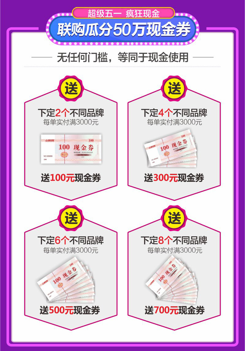 3、聯(lián)購滿額瓜分50萬現(xiàn)金券:5月1日-5月4日活動期間,顧客每單實(shí)付3000元,下定2個不同品牌,即送100元現(xiàn)金券,下定4個不同品牌,即送300元現(xiàn)金券,下定6個不同品牌,即送500元現(xiàn)金券,國安居準(zhǔn)備了50W現(xiàn)金券,送完即止。