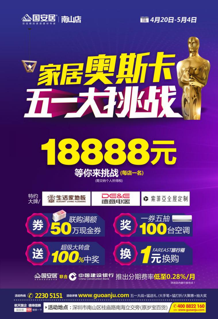 4月20號~5月4號,南山國安居家居奧斯卡五一大挑戰(zhàn)盛大開啟,一大波福利和超值優(yōu)惠來襲,準(zhǔn)備好接招了嗎?