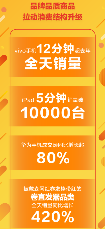 作為傳統(tǒng)優(yōu)勢品類,手機(jī)在今年618年中購物節(jié)首日的表現(xiàn)仍舊搶眼。vivo手機(jī)12分鐘超去年全天銷量,最終全天的銷量達(dá)到去年同期的11倍;華為手機(jī)成交額同比增長超80%,華為手機(jī)配件成交額同比增長超300%; iPad在5分鐘的銷量就突破萬臺(tái)。