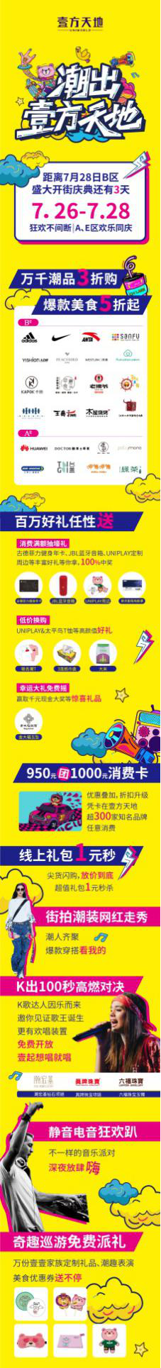開業(yè)期間,精彩紛呈的活動(dòng)當(dāng)然是必不可少的。7.26-7.28開業(yè)期間,B區(qū)將聯(lián)動(dòng)A區(qū)、E區(qū)開展一系列活動(dòng)。開業(yè)活動(dòng)緊扣B區(qū)定位“潮流品味先鋒主場”,充分抓住當(dāng)下年輕人愛玩、敢玩的特色,將整個(gè)壹方天地變?yōu)槌比?、炫酷的歡樂海洋。