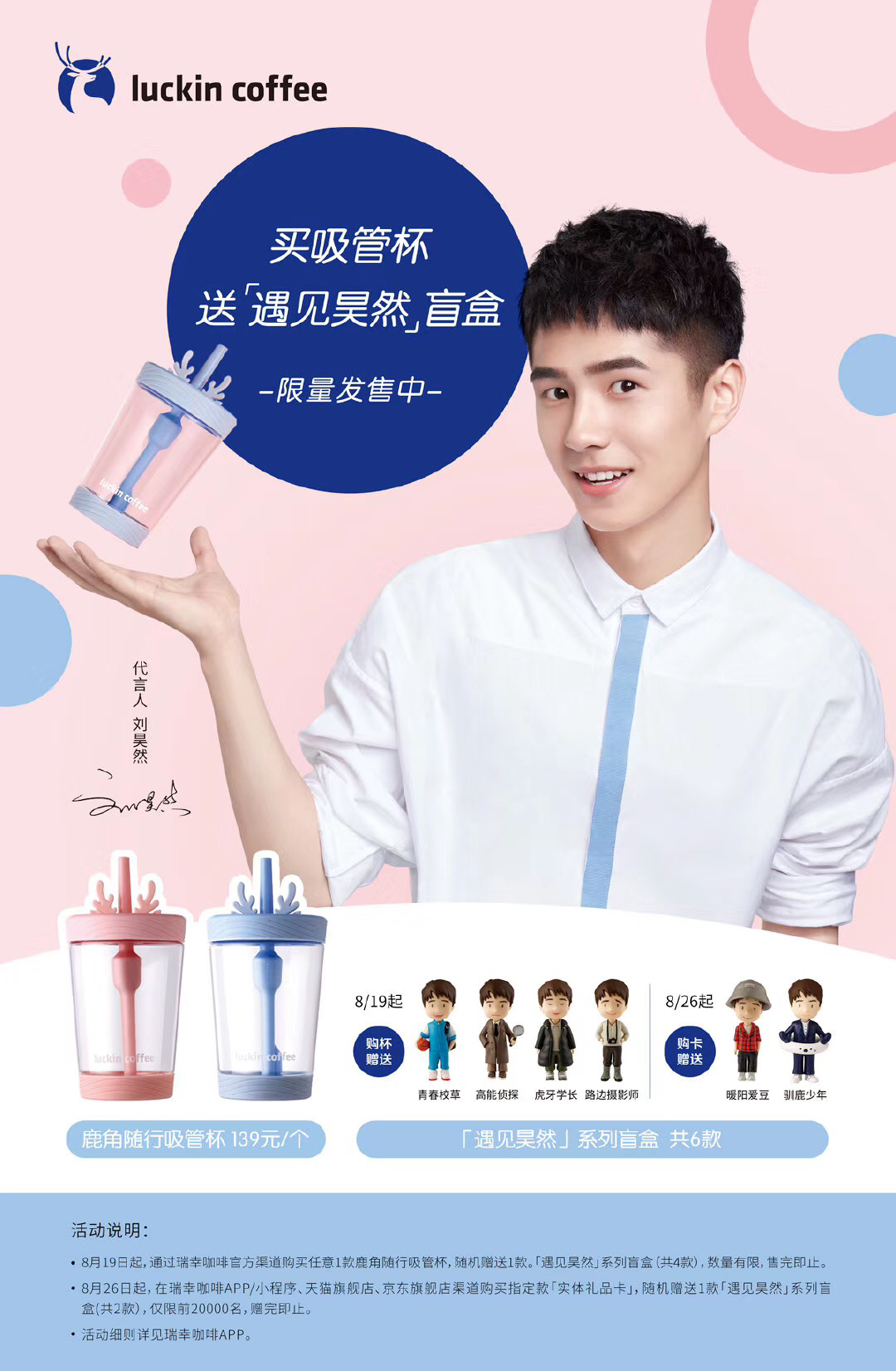 據(jù)了解,該系列盲盒共分為六款。其中,8月19至9月18日期間上線四款,用戶購買任意一款鹿角吸管杯,將隨機獲贈遇見昊然系列盲盒一個;剩余兩款則將在8月26日瑞幸咖啡上線實體禮品卡時同步上線。