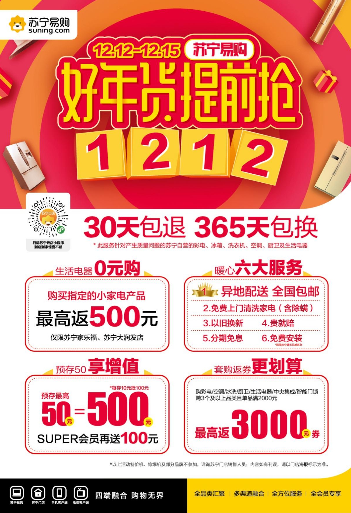深圳新聞網(wǎng)2019年12月11日訊 2019年進(jìn)入到了最后一個(gè)月,每年的年末不論商家還是個(gè)人都處于忙碌的狀態(tài),加之2020年的春節(jié)即將到來,采買年貨也被大家提上了日程。相較于吃喝來說,家電、家裝的換新更能為春節(jié)增添“新年新氣象”的氛圍,因此12月12日至12月15日深圳蘇寧開啟雙十二好年貨提前搶,為廣大深圳消費(fèi)者帶來一場(chǎng)超級(jí)年貨搶購盛宴。