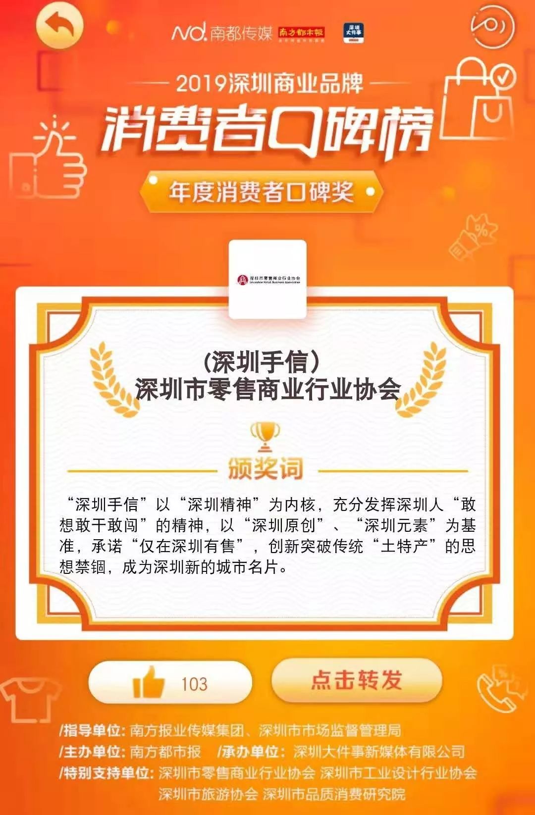 深圳手信作為深圳的城市品牌順利斬獲2019年“深圳商業(yè)品牌·消費(fèi)者口碑榜”【年度口碑大獎】。作為城市之禮,“深圳手信強(qiáng)調(diào)“深圳精神”創(chuàng)新內(nèi)核,臻選一城好禮,所有產(chǎn)品來自深圳本土優(yōu)秀企業(yè)。
