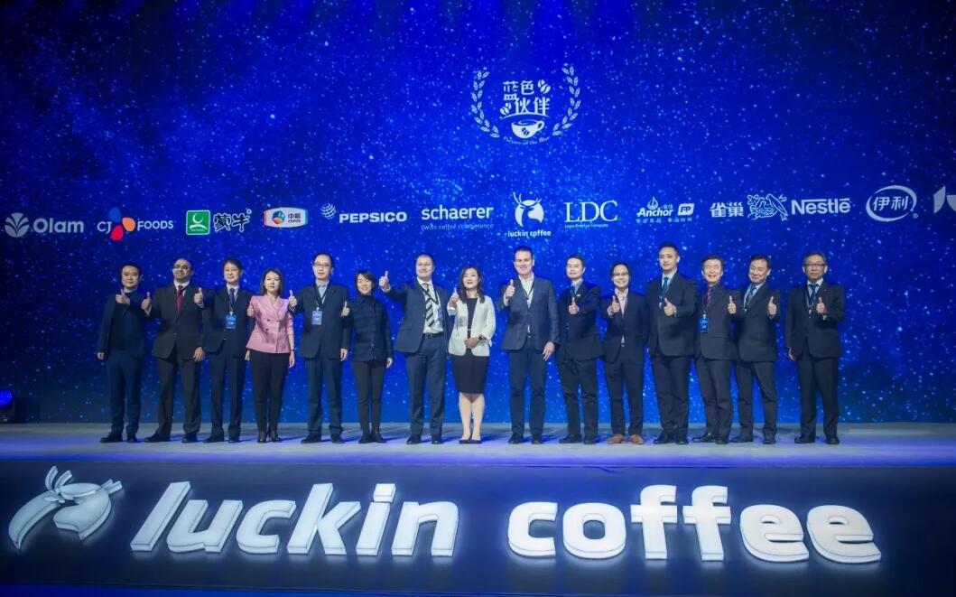 發(fā)布會現(xiàn)場,瑞幸咖啡與百事公司(PepsiCo)、雀巢(Nestle)、恒天然(Fonterra)、雪萊(Schaerer)、路易達孚(LDC)、奧蘭(Olam)、中糧、希杰(CJ)、伊利、蒙牛、好麗友、卡樂比等14家全球頂級供應商共同啟動無人零售戰(zhàn)略發(fā)布儀式。