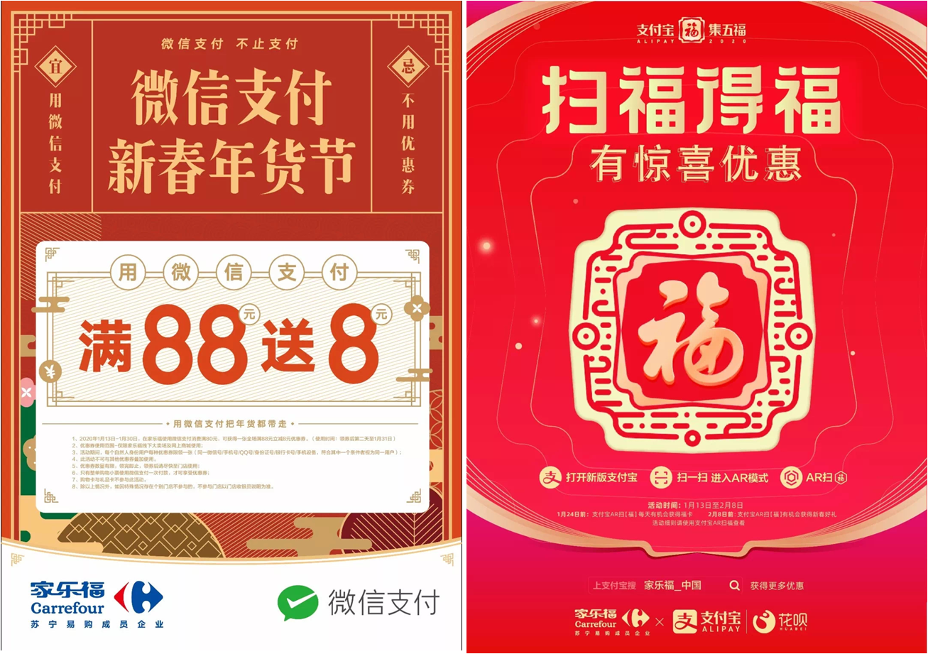 除此之外,各大支付平臺優(yōu)惠券亦開始發(fā)放,助力您的年貨采買。前方高能預(yù)警!1月13日至2月8日,顧客使用支付寶掃上圖“?!弊忠约皡⑴c集五福活動,即有機會獲得家樂福全場滿200減10優(yōu)惠券。1月13日至1月30日,在家樂福使用微信支付消費滿80元,可獲得一張全場滿88元立減8元優(yōu)惠券,