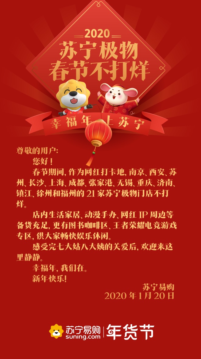 深圳新聞網(wǎng)2020年1月21日訊 春節(jié)臨近,忙著打烊成為了商家常態(tài)。有意思的是,1月20日,蘇寧連發(fā)9條通知,廣而告之“不打烊”。通知顯示,物流、蘇寧幫客、蘇寧快修、以舊換新等服務內(nèi)容,電器店、家樂福、零售云、紅孩子門店、極物等線下業(yè)態(tài)都確保不打烊、不漲價。
