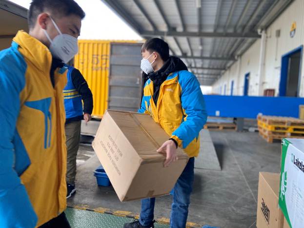 蘇寧華中物流園,蘇寧物流將防疫物資裝車送到醫(yī)務(wù)工作者、前線記者、快遞員手中