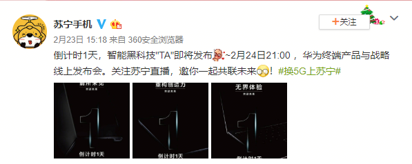 今晚21點多款華為新品將在蘇寧直播重磅亮相,除了新品發(fā)布外,蘇寧直播還將進行開箱直播,讓用戶直觀感知到華為Mate Xs折疊屏產(chǎn)品。