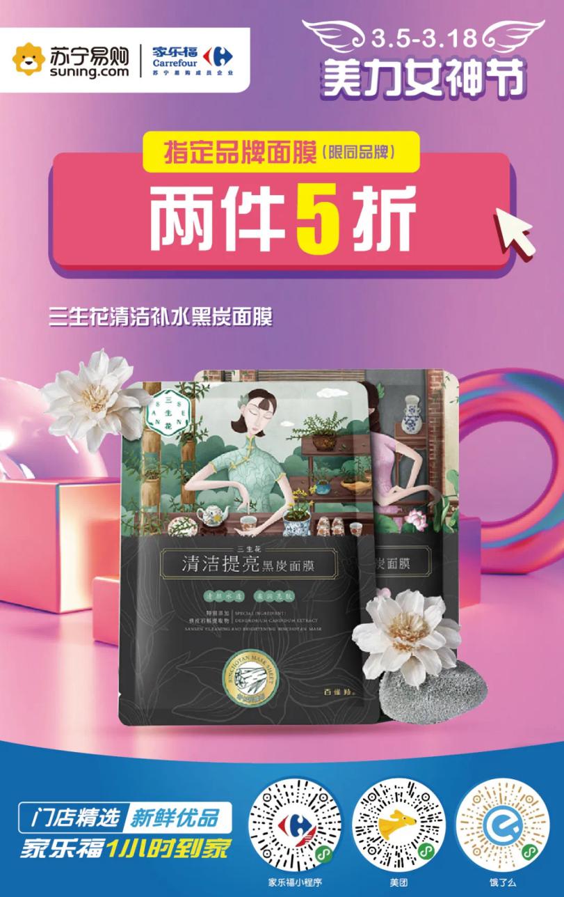 此外,3月5日至3月18日,指定品牌面膜兩件5折,一鍵下單,家樂(lè)福“碼”上送到家。