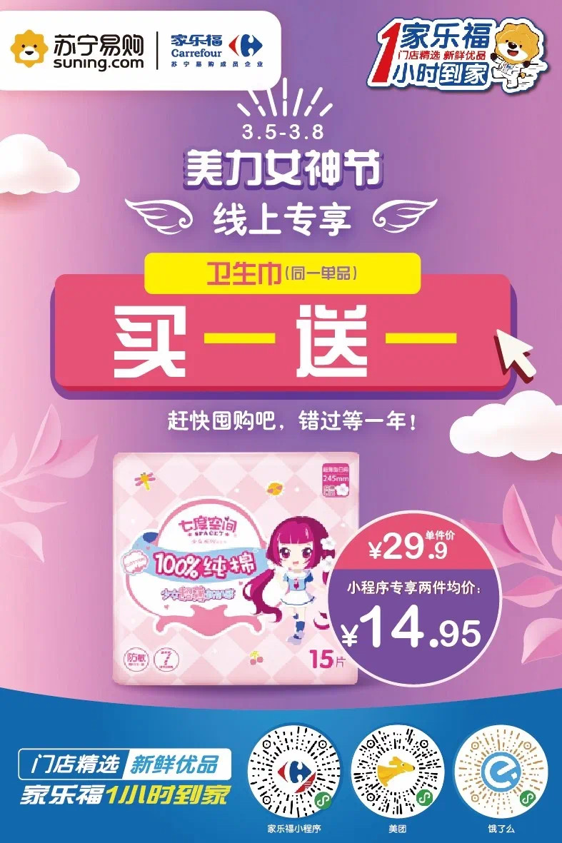 當(dāng)然,家樂(lè)福也一直在線,給你們送上儀式感節(jié)日福利。3月5日至3月8日,家樂(lè)福美“力”女神節(jié)熱辣來(lái)襲。家樂(lè)福小程序、蘇寧易購(gòu)APP、蘇寧小店APP、美團(tuán)外賣和餓么了五大線上平臺(tái)“火力全開(kāi)”,讓你的美麗一直營(yíng)業(yè)不打烊。