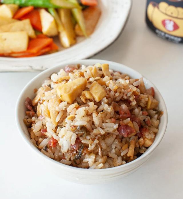5.米飯煮熟后,把炒好的料倒入電飯煲中,翻拌均勻,再次蓋上蓋,用電飯煲保溫燜10分鐘。即可出鍋享用啦。