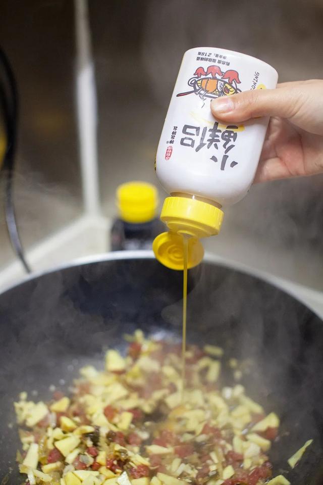 4.加入適量小鮮侶、醬油心生調(diào)味。臘腸、雪菜本身就會咸,不用再加鹽,食材炒熟即可出鍋。