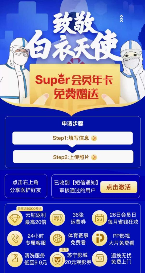 見圳客戶端·深圳新聞網(wǎng)2020年4月7日訊 自從3月27日蘇寧易購(gòu)為醫(yī)護(hù)人員開放Super會(huì)員免費(fèi)申領(lǐng)活動(dòng)起,引發(fā)全國(guó)醫(yī)務(wù)工作者關(guān)注。數(shù)據(jù)顯示,3月27日-4月2日,活動(dòng)線上申請(qǐng)人數(shù)日均增長(zhǎng)59%。尤其在蘇寧易購(gòu)宣布擴(kuò)大贈(zèng)送范圍之后,藥師申請(qǐng)人數(shù)日均增長(zhǎng)達(dá)89%,技師申請(qǐng)人數(shù)日均增長(zhǎng)達(dá)145%,包括公共衛(wèi)生醫(yī)師、感染管理、心理治療師、醫(yī)院信息科工程師、救護(hù)車駕駛員等,也紛紛遞交了申請(qǐng)。