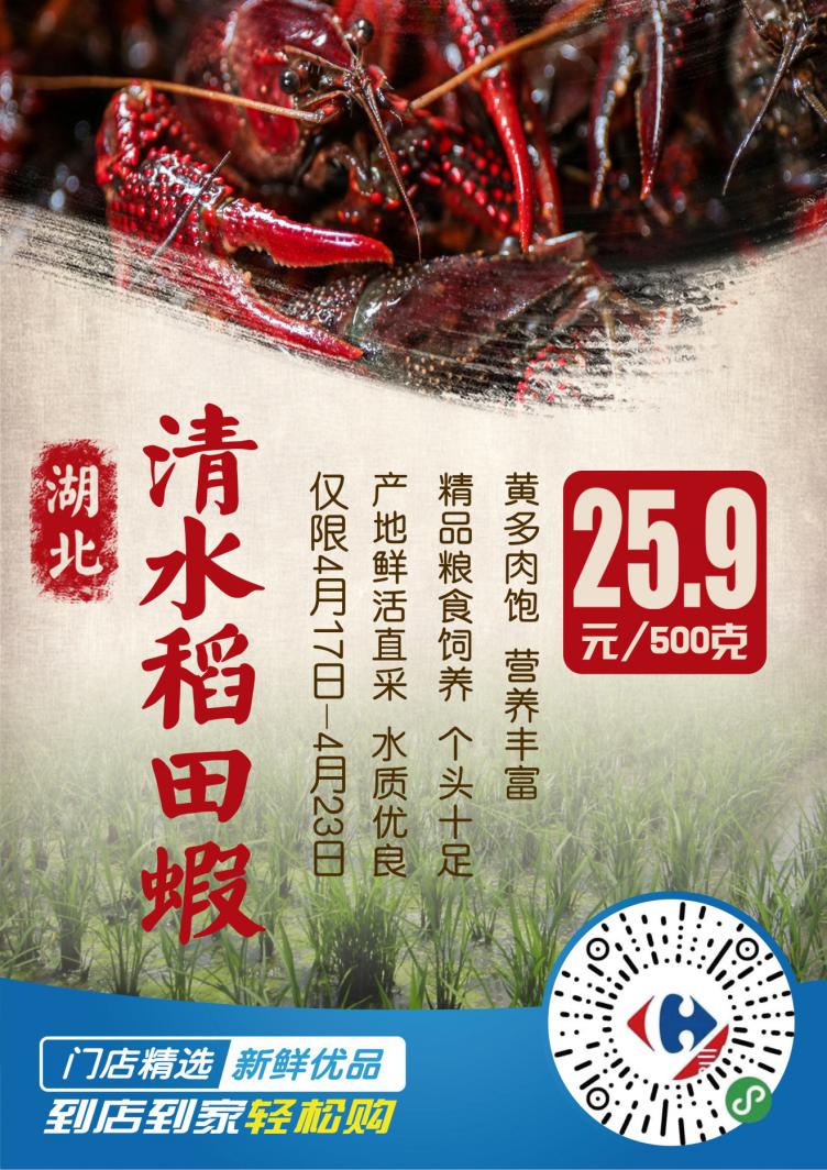 15號(hào)開(kāi)始捕撈的這批湖北“清水稻田蝦”將于16號(hào)完成分揀裝車,發(fā)往家樂(lè)福全國(guó)各地大倉(cāng),17號(hào),家樂(lè)福位于北京,上海、哈爾濱,長(zhǎng)沙,成都,昆明,廣州,深圳等地的155家門(mén)店鮮活開(kāi)售,恰逢家樂(lè)福418購(gòu)物節(jié),嘗鮮價(jià)低到25.9元/500克(僅限4月17日至23日)。同時(shí),顧客還可以通過(guò)家樂(lè)福小程序、蘇寧易購(gòu)app、蘇寧小店App、及美團(tuán)、餓了么下單,享受1小時(shí)送到家的極致“鮮“體驗(yàn)。