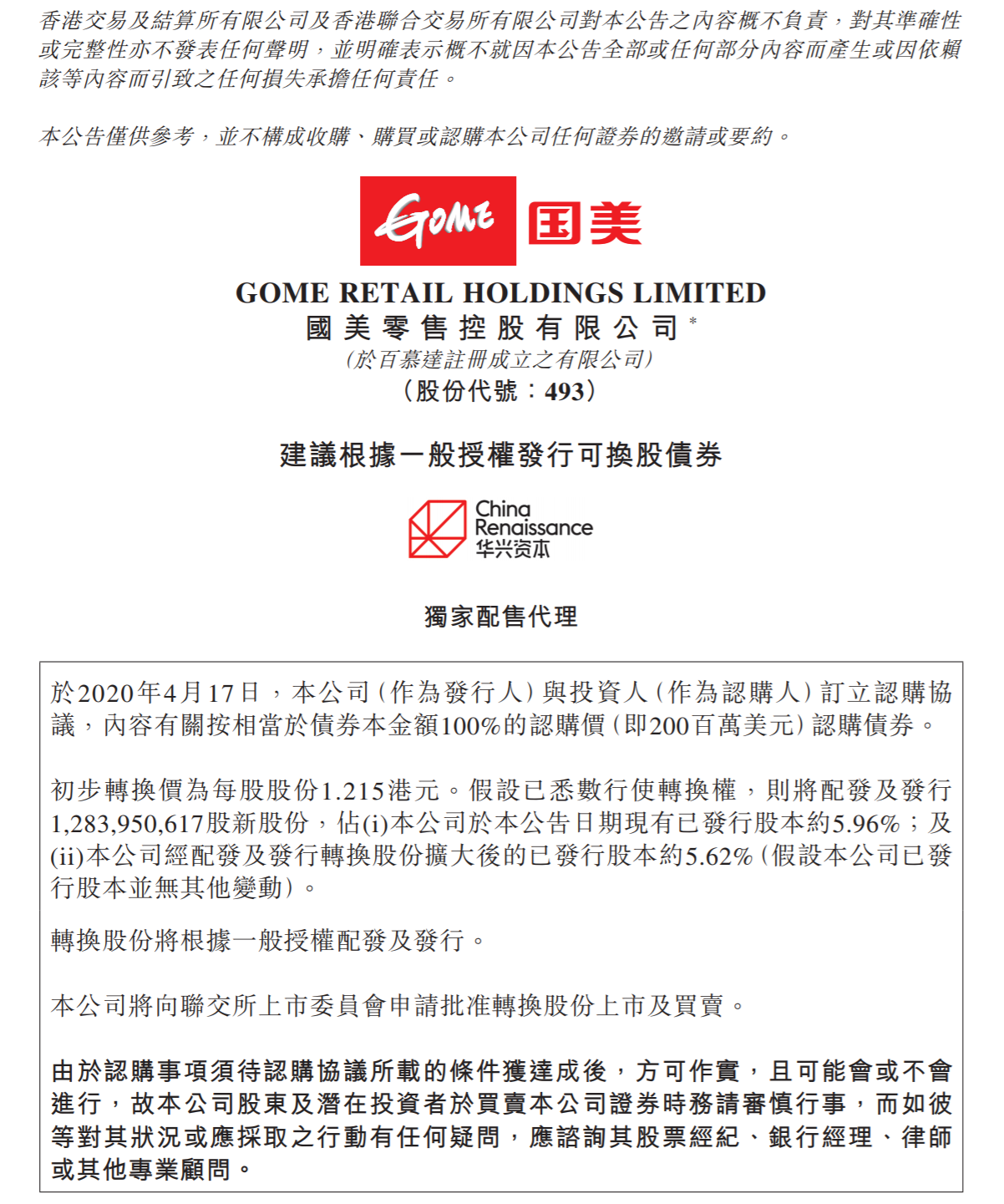 公告稱,拼多多以總計2億美金的可轉(zhuǎn)換債券方式對國美進(jìn)行戰(zhàn)略投資。根據(jù)協(xié)議,初步股份轉(zhuǎn)換價為每股1.215港元,分別較國美零售2020年4月17日收盤價及截至2020年4月16日前五個連續(xù)交易日之平均收盤價溢價66.44%及68.75%。