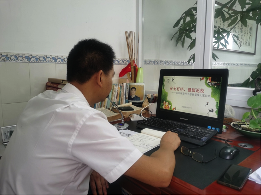 赤沙小學(xué)校長(zhǎng)李錦賢通過企業(yè)微信召開復(fù)學(xué)前的線上家長(zhǎng)會(huì)。