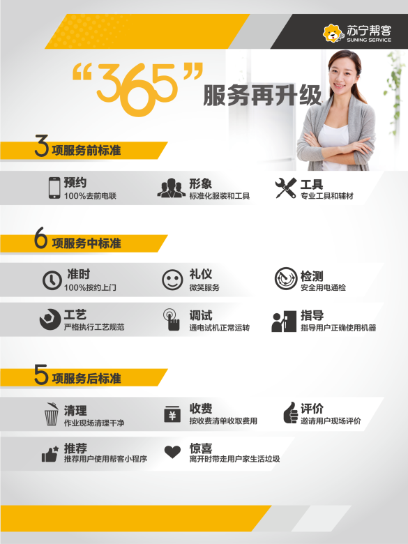“三分產(chǎn)品七分安裝”,超60萬套空調(diào),如何保障快速及時的安裝?蘇寧幫客負(fù)責(zé)人告訴記者,蘇寧全國區(qū)域空調(diào)售后服務(wù)堅持貨到24小時上門安裝的服務(wù)時效,并按照用戶預(yù)約時間準(zhǔn)時上門。不僅如此,全國蘇寧幫客空調(diào)安裝服務(wù)統(tǒng)一堅持365服務(wù)標(biāo)準(zhǔn),覆蓋作業(yè)前、中、后期的工服、工牌、鞋套、墊機(jī)布、收費(fèi)標(biāo)準(zhǔn)、衛(wèi)生維護(hù)等多項標(biāo)準(zhǔn),并歡迎用戶監(jiān)督。