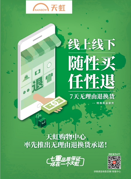今年4月,為了營造溫暖舒心的消費(fèi)環(huán)境,深圳市消費(fèi)者委員會(huì)發(fā)起“線下無理由退貨承諾”,鼓勵(lì)深圳線下實(shí)體店參與,改善居民消費(fèi)體驗(yàn),增強(qiáng)居民消費(fèi)信心。天虹積極響應(yīng)號(hào)召,作為深圳首批“線下無理由退貨”的實(shí)體店參與并向廣大消費(fèi)者作出服服承諾,也將“承諾”推廣至全國。值得一提的是,為了讓購物中心的消費(fèi)者能共享,天虹首次嘗試在購物中心業(yè)態(tài)也深耕這項(xiàng)服務(wù),竭力滿足顧客需求。