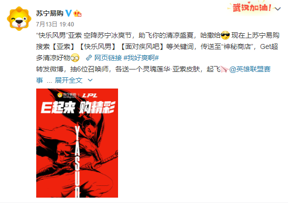 另據(jù)蘇寧官方消息,7月11日~7月18日蘇寧冰爽節(jié)期間,除每千減百、百億補(bǔ)貼,蘇寧冰爽節(jié)亞索主題會場還為英雄聯(lián)盟玩家粉絲帶來了亞索新皮膚“靈魂蓮華”、風(fēng)扇等好物組成的“快樂大禮包”,用戶可通過下單購物、微博互動等方式獲取。