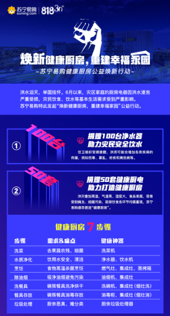 與此同時,洪水致使大批廚房電器受損,疊加高溫天氣,災(zāi)民飲食安全面臨考驗。蘇寧易購特別捐贈50套健康廚電,涵蓋油煙機、灶具、消毒柜等必備廚房電器,讓災(zāi)民更快恢復(fù)健康生活。同時,廚房作為“病從口入”最關(guān)鍵的環(huán)節(jié),洗菜、水質(zhì)凈化、烹飪除油煙、餐具清潔消毒、廚余垃圾處理等每一環(huán)都不容忽視,蘇寧易購特別倡導“健康廚房7步驟”,全流程打造健康廚房,并借助蘇寧易購雙線渠道全面開展科普活動。