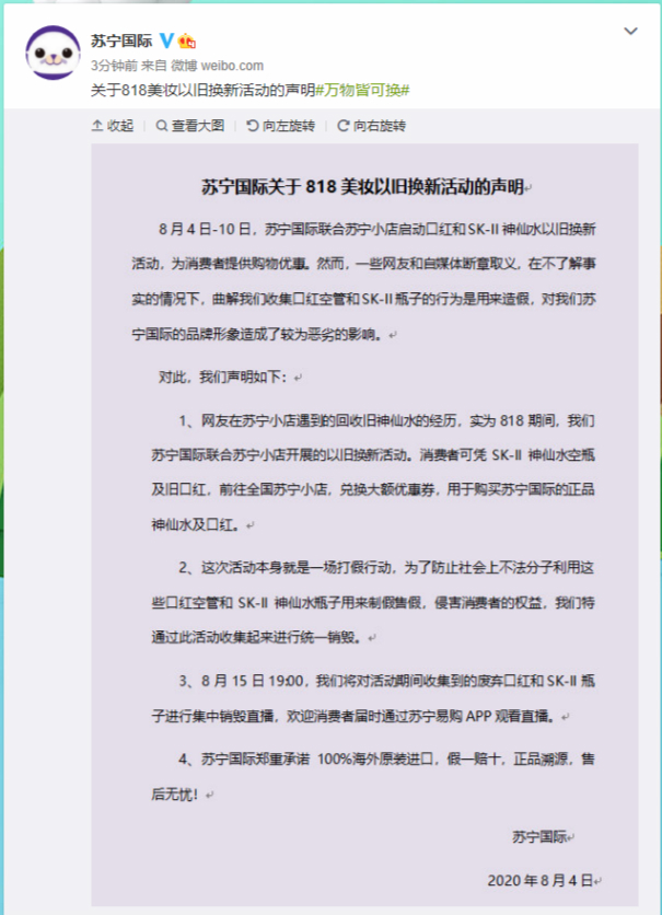 “我們的活動(dòng),原本是為了防止社會(huì)上不法分子,利用這些口紅空管和神仙水瓶子用來(lái)制假售假,侵害消費(fèi)者的權(quán)益,沒(méi)想到會(huì)被部分網(wǎng)友曲解。希望消費(fèi)者都能理性思考,獨(dú)立判斷,勿信謠傳謠?!碧K寧國(guó)際相關(guān)負(fù)責(zé)人表示。