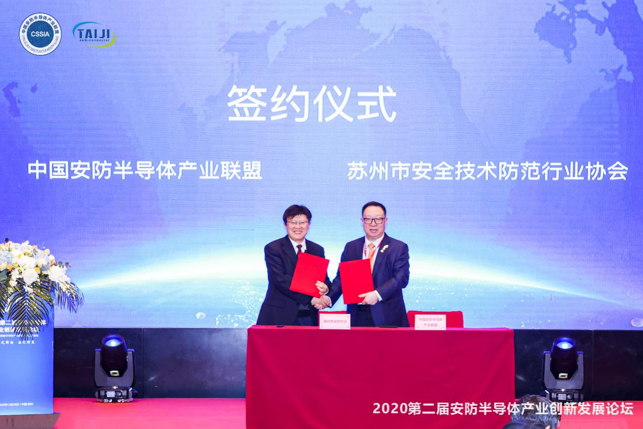 中國安防半導體產(chǎn)業(yè)聯(lián)盟主席楊金才和蘇州市安全技術(shù)防范行業(yè)協(xié)會秘書長王坤泉現(xiàn)場進行簽約