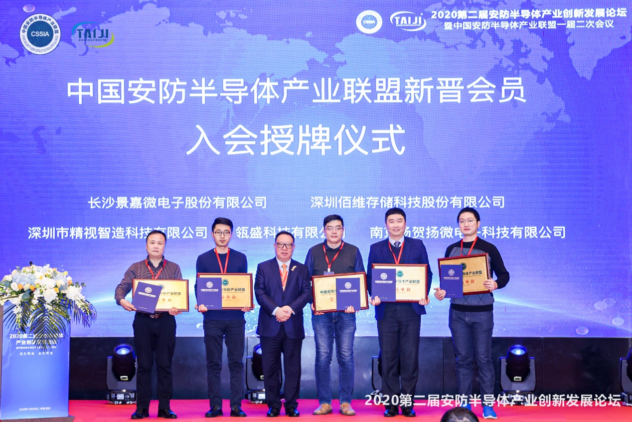 會議尾聲,還舉行了中國安防半導體產(chǎn)業(yè)聯(lián)盟新晉會員單位入會授牌儀式。深圳佰維存儲科技股份有限公司、長沙景嘉微電子股份有限公司榮膺聯(lián)盟理事單位,瓴盛科技有限公司、深圳市精視智造科技有限公司,南京揚賀揚微電子科技有限公司榮膺聯(lián)盟會員單位。中國安防半導體產(chǎn)業(yè)聯(lián)盟主席楊金才為以上單位進行授牌。