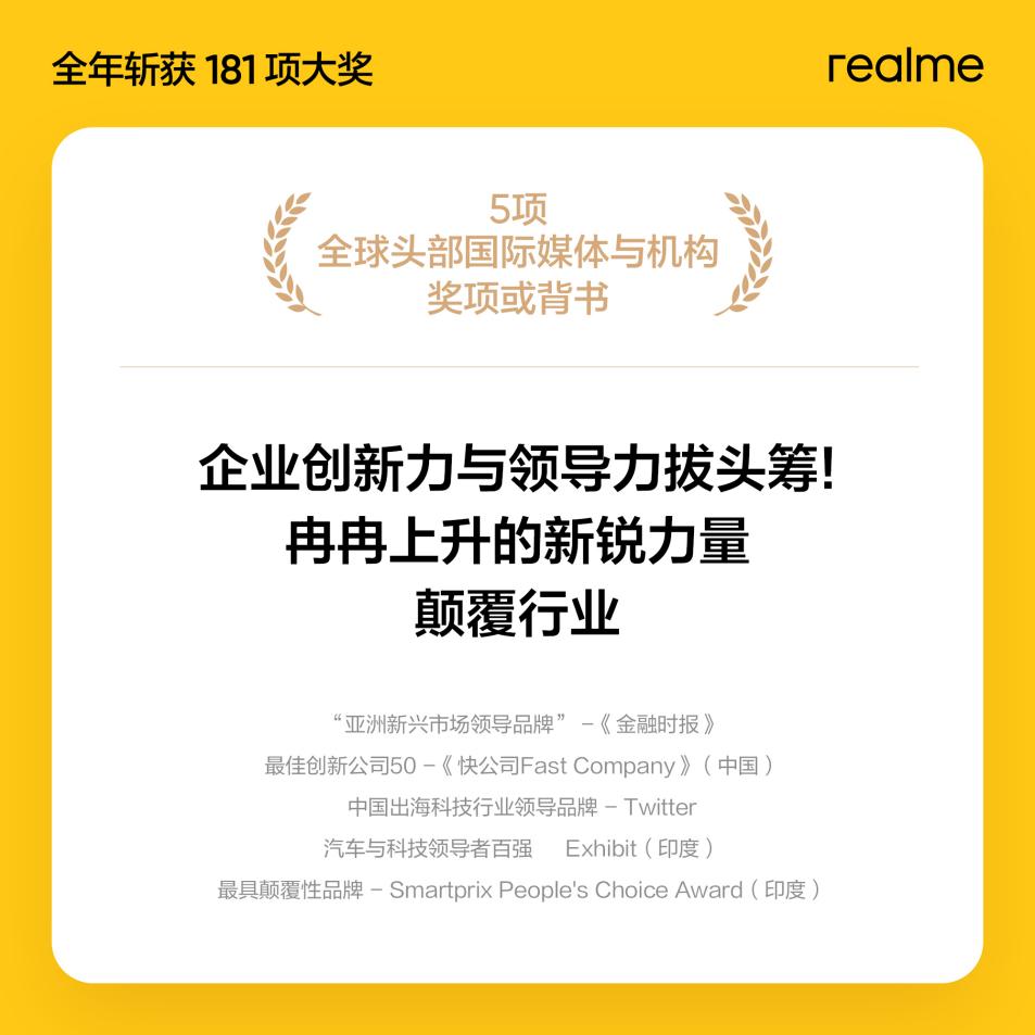 2020年,realme在全球斬獲了17個(gè)企業(yè)和品牌維度的獎(jiǎng)項(xiàng),企業(yè)創(chuàng)新力與領(lǐng)導(dǎo)力獲得業(yè)界認(rèn)可。國(guó)際權(quán)威媒體《金融時(shí)報(bào)》肯定了realme在亞太地區(qū)的領(lǐng)先地位。Financial Times、快公司、Twitter、Exhibi等媒體與機(jī)構(gòu)授予realme“亞洲新興市場(chǎng)領(lǐng)導(dǎo)品牌”、“最佳創(chuàng)新公司50”、“中國(guó)出??萍夹袠I(yè)領(lǐng)導(dǎo)品牌”、“汽車與科技領(lǐng)導(dǎo)者百?gòu)?qiáng)”以及“最具顛覆性品牌”五項(xiàng)大獎(jiǎng)。realme品牌潛力不斷釋放,業(yè)界普遍認(rèn)為,在過去的一年里,realme品牌的增勢(shì)強(qiáng)勁,全球品牌價(jià)值在不斷躍升。