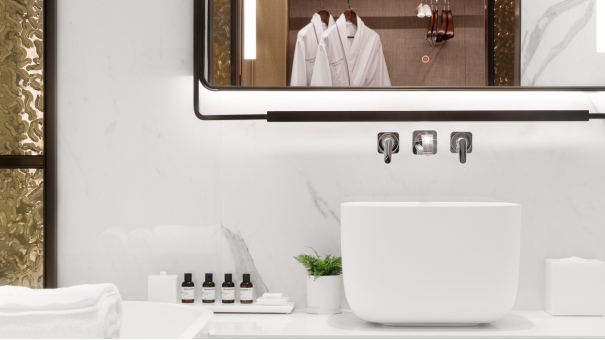 夜幕降臨,賓客可慵懶地置身浴缸之中,閉目享受由B&O音響帶來(lái)的音樂(lè)廳般沉浸式體驗(yàn)?;驈娘h臺(tái)取過(guò)剛剛煮好的香茗,讓茶香雅韻充盈唇齒。酒店備好的浴品套裝,將讓賓客從發(fā)絲到肌膚,皆浸潤(rùn)于LE LABO的香氛宇宙,奢寵體驗(yàn)無(wú)與倫比。