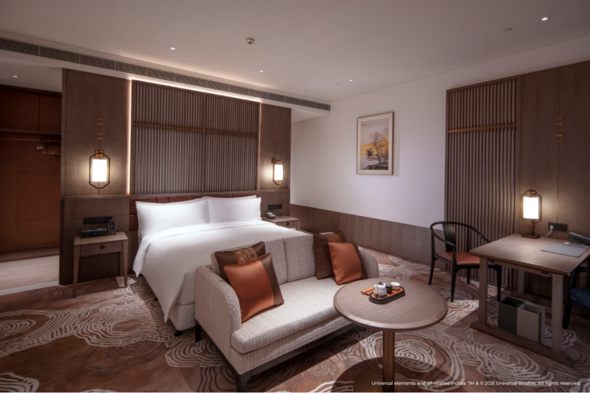 酒店設(shè)計以當(dāng)代視角詮釋中國傳統(tǒng)文化及人文歷史底蘊,兼具現(xiàn)代便捷與奢華典雅。與此同時,400間寬敞雅致的客房設(shè)計也融入了中國古典皇家園林的精巧設(shè)計,以天然材料刻畫自然之美。作為品牌標(biāo)志性的元素之一,所有客房均配備有煮茶套裝,賓客可以在驚險刺激的主題游園體驗之后享受輕松愉悅的茗茶時光;此外,位于酒店大堂吧的專屬茶室還將提供專業(yè)的互動品茗體驗。