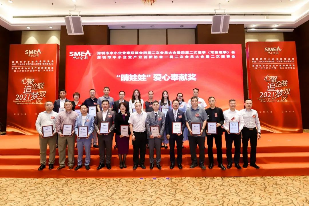 深圳市中小企業(yè)服務(wù)局副局長陳小林(一排左六)為獲得感恩相伴獎的企業(yè)家頒獎
