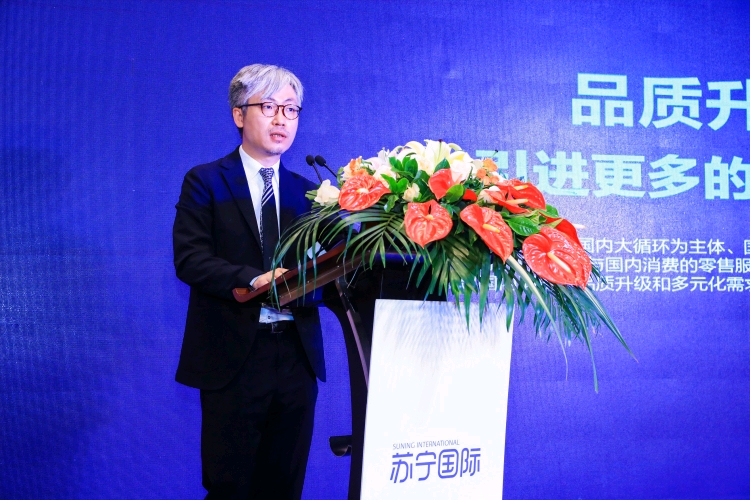 (圖:首屆消博會期間,蘇寧家樂福商品副總裁陳尚斌在蘇寧國際全球合作伙伴大會上發(fā)表演講)