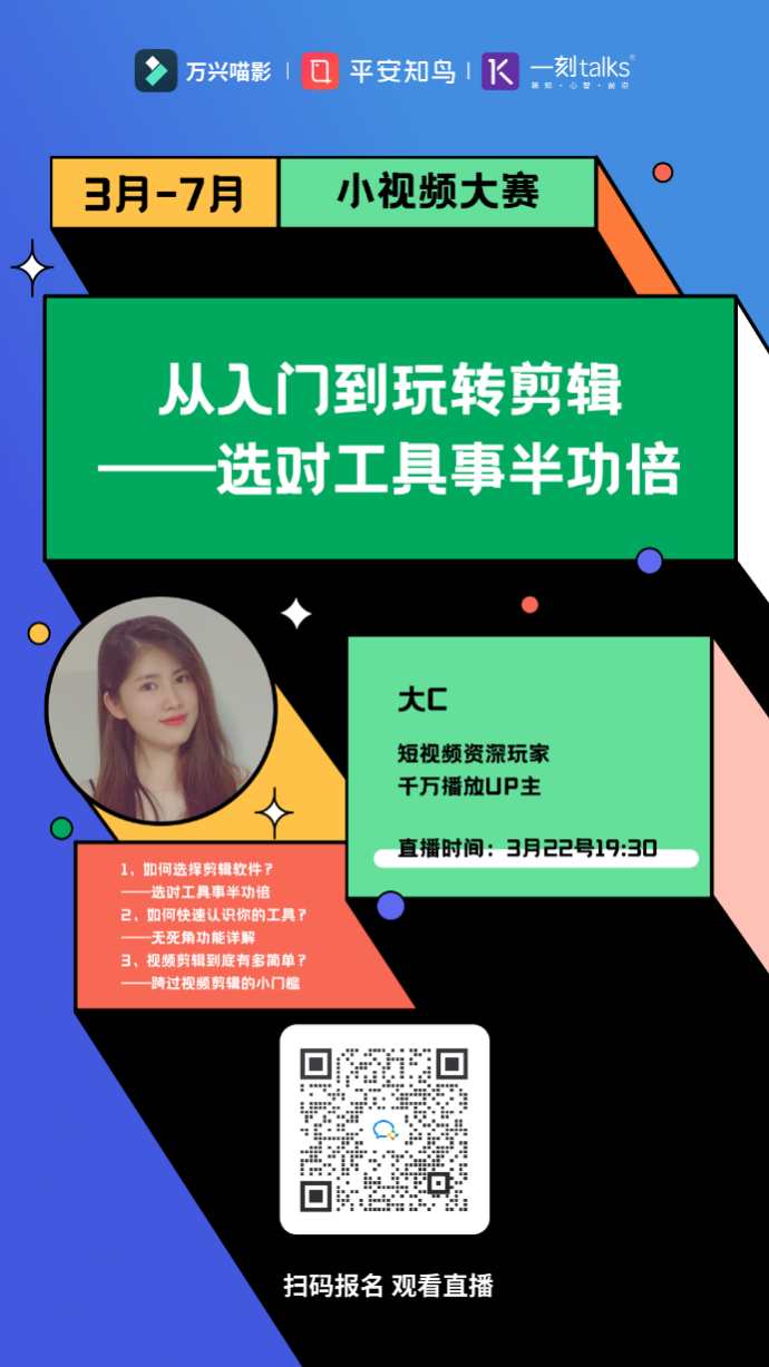 據(jù)悉,#一分鐘SHOW職場干貨#小視頻大賽自3月求職季上線,將持續(xù)至7月底,為期4個(gè)月,大賽包含作品提交至平安知鳥APP、12場線上直播、線上初賽、晉級(jí)復(fù)賽、線下決賽及頒獎(jiǎng)典禮等環(huán)節(jié)。根據(jù)規(guī)劃,大賽設(shè)有專家評(píng)審委員會(huì)、培訓(xùn)專家團(tuán),并設(shè)置數(shù)十萬獎(jiǎng)金池,獲獎(jiǎng)?wù)卟粌H將有機(jī)會(huì)瓜分獎(jiǎng)金大獎(jiǎng),更有機(jī)會(huì)成為職場知識(shí)網(wǎng)紅“C位”出道。萬興喵影作為活動(dòng)主辦方之一,在此次大賽中將提供視頻創(chuàng)意軟件工具、活動(dòng)專用視頻資源包、千萬播放UP主視頻制作講解直播課等資源,全方位賦能選手輸出高品質(zhì)內(nèi)容。