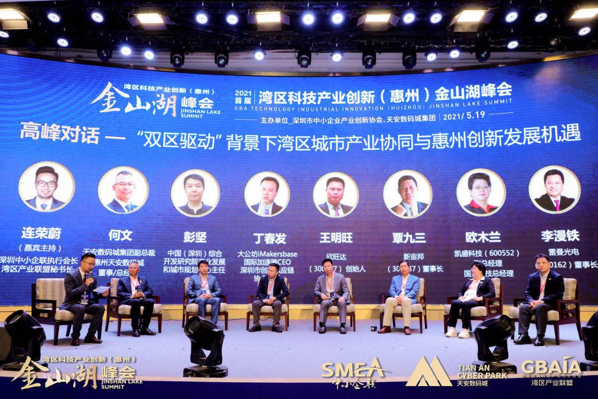 圓桌論壇環(huán)節(jié),特邀天安數(shù)碼城集團副總裁、惠州天安數(shù)碼城董事/總經(jīng)理何文,中國(深圳)綜合開發(fā)研究院產(chǎn)業(yè)發(fā)展和城市規(guī)劃中心主任彭堅,大公坊iMakerbase國際加速器CEO、深圳市創(chuàng)客供應(yīng)鏈協(xié)會會長丁春發(fā),欣旺達(300207)創(chuàng)始人王明旺,新宙邦(300037)董事長覃九三,凱盛科技(600552)副總經(jīng)理、國顯科技總經(jīng)理歐木蘭,雷曼光電(300162)董事長李漫鐵,由深圳中小企聯(lián)執(zhí)行會長、灣區(qū)產(chǎn)業(yè)聯(lián)盟秘書長連榮蔚主持,圍繞《“雙區(qū)驅(qū)動”背景下灣區(qū)城市產(chǎn)業(yè)協(xié)同與惠州創(chuàng)新發(fā)展機遇》主題展開討論。