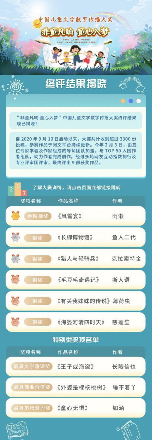 深圳新聞網(wǎng)2021年6月1日訊“非童凡響童心入夢(mèng)”中國兒童文學(xué)數(shù)字傳播大獎(jiǎng)6月1日揭曉終評(píng)結(jié)果,《風(fēng)雪宴》等9部參賽作品從3300余部作品中脫穎而出。大獎(jiǎng)終評(píng)頁面已在人民日?qǐng)?bào)數(shù)字傳播有限公司旗下“人民閱讀”平臺(tái)、中國中福會(huì)出版社、閱文集團(tuán)等平臺(tái)全面上線。