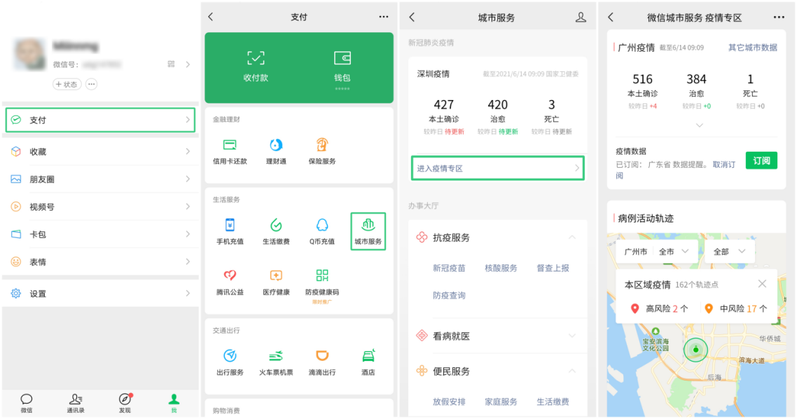 讀特客戶端·深圳新聞網(wǎng)2021年6月16日訊 (記者 田志強(qiáng))端午期間,為減少疫情傳播風(fēng)險(xiǎn),廣東市民紛紛響應(yīng)號召實(shí)行就地過節(jié),落實(shí)非必要不出省的相關(guān)要求。為進(jìn)一步助力廣東及全國人民抗疫,為市民提供準(zhǔn)確疫情資訊及抗疫服務(wù),近日,微信更新城市服務(wù)疫情專區(qū),支持查看疫情數(shù)據(jù)、病例活動軌跡、疫情資訊以及接入抗疫服務(wù)。全國用戶打開“我-支付-城市服務(wù)-疫情專區(qū)”,即可快速觸達(dá)各類疫情相關(guān)服務(wù)。