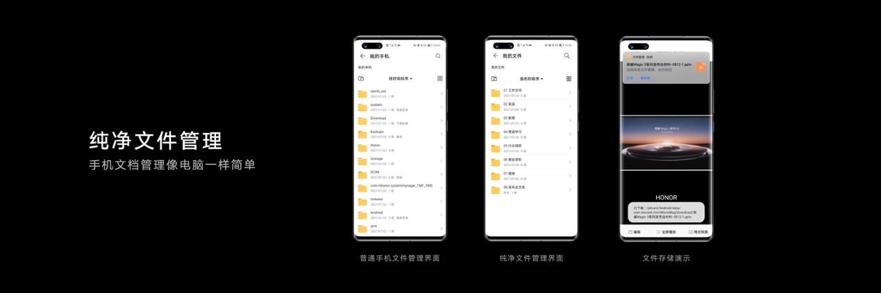 為了幫助事務(wù)繁多的商務(wù)人士更高效管理個(gè)人事務(wù),榮耀還與各辦公平臺(tái)合作,讓用戶在釘釘、飛書、Welink、WPS辦公平臺(tái)的日程均能通過(guò)榮耀Magic3系列進(jìn)行統(tǒng)一管理。而新增的純凈文件管理系統(tǒng)(此功能后續(xù)通過(guò) OTA升級(jí)支持),則使榮耀Magic3系列在文件保存和管理方面進(jìn)行進(jìn)一步簡(jiǎn)化,讓手機(jī)文件管理從此可以像電腦一樣簡(jiǎn)單便捷。
