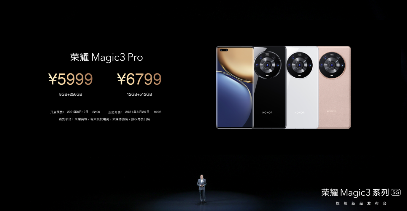 榮耀 M agic38GB+128GB版售價(jià)4599元,8GB+256GB版售價(jià)4999元;榮耀Magic3 Pro8GB+256GB版售價(jià)5999元,12GB+512GB版售價(jià)6799元;榮耀Magic3至臻版12GB+512GB售價(jià)7999元。8月12日22:00榮耀 Magic3系列手機(jī)正式開(kāi)啟預(yù)售,8月20日10點(diǎn)08分,榮耀 M agic3系列手機(jī)將于榮耀商城、各大授權(quán)電商、榮耀體驗(yàn)店、榮耀零售門店等全平臺(tái)開(kāi)售。