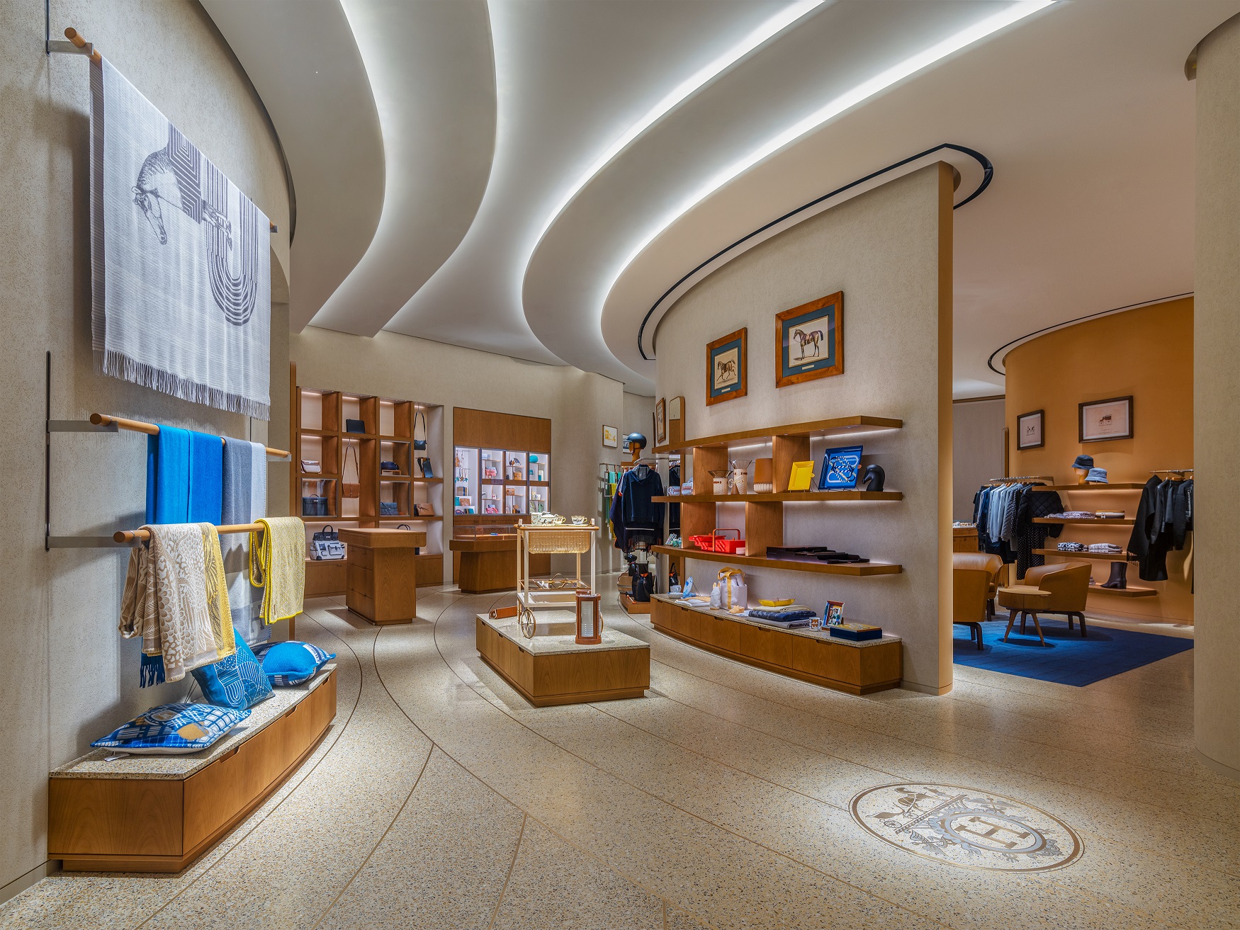 優(yōu)雅的專(zhuān)賣(mài)店空間由巴黎建筑事務(wù)所RDAI精心打造,并根植于品牌傳承精髓,將現(xiàn)代極簡(jiǎn)主義風(fēng)格與源自本地的傳統(tǒng)工藝巧妙結(jié)合。賓客從正門(mén)步入店內(nèi),愛(ài)馬仕標(biāo)志性希臘式琉璃球頂燈的柔光傾瀉而下,與地面上黃銅裝飾的藏書(shū)章標(biāo)志遙相呼應(yīng),不同區(qū)域間流暢銜接,整體空間皆可被賓客盡收眼底。絲巾區(qū)域陳列著各式豐富色彩的印花絲巾;與之相鄰的美妝區(qū)域則歡迎賓客在此盡情體驗(yàn)RougeHermès唇妝系列。