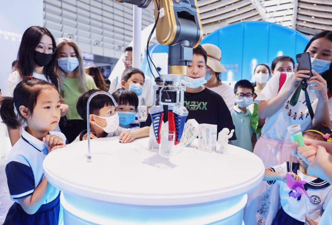 這牛奶和其他的不太一樣,很香濃?!半x心精萃‘白科技’開啟臻濃新紀元”展臺一直就是博覽會現(xiàn)場的“人氣王”,這里以宇宙探索為主題,科幻感十足,火箭發(fā)動機噴出淡淡煙霧,三臺智能機械臂不停忙碌,人們排起長隊,品嘗由“離心精萃科技”現(xiàn)場調制的伊利臻濃牛奶。在這里,吸引觀眾的不僅是美味的伊利牛奶,也有滿滿的數字科技。